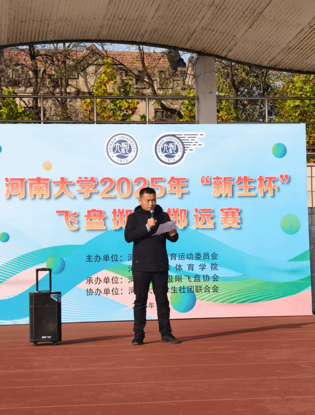 11月16日,校体委和体育学院共同举办2025年“新生杯”飞盘掷准掷远赛,体育学院副院长朱翼为赛事致开幕辞,鼓励同学们在飞盘运动中感受团队协作的快乐,用汗水锤炼意志,以运动健全人格。