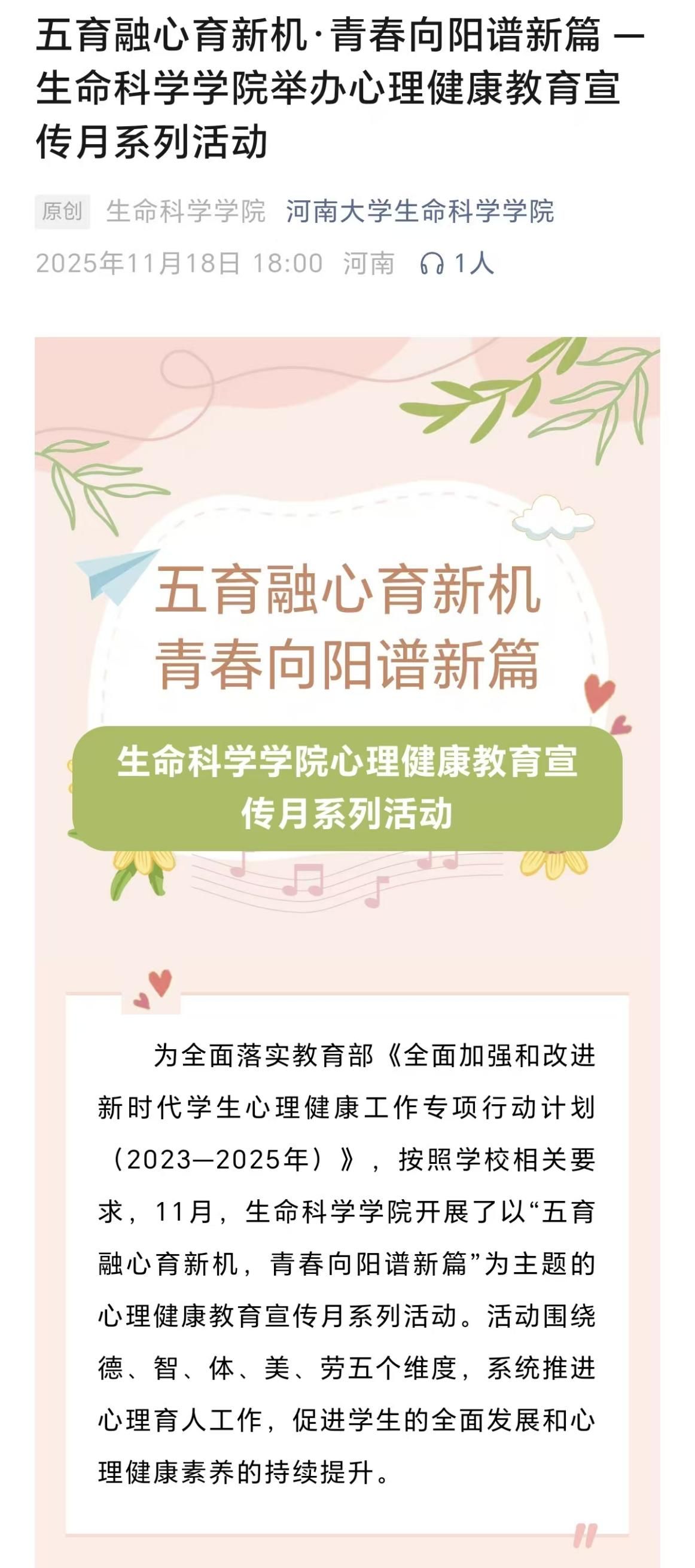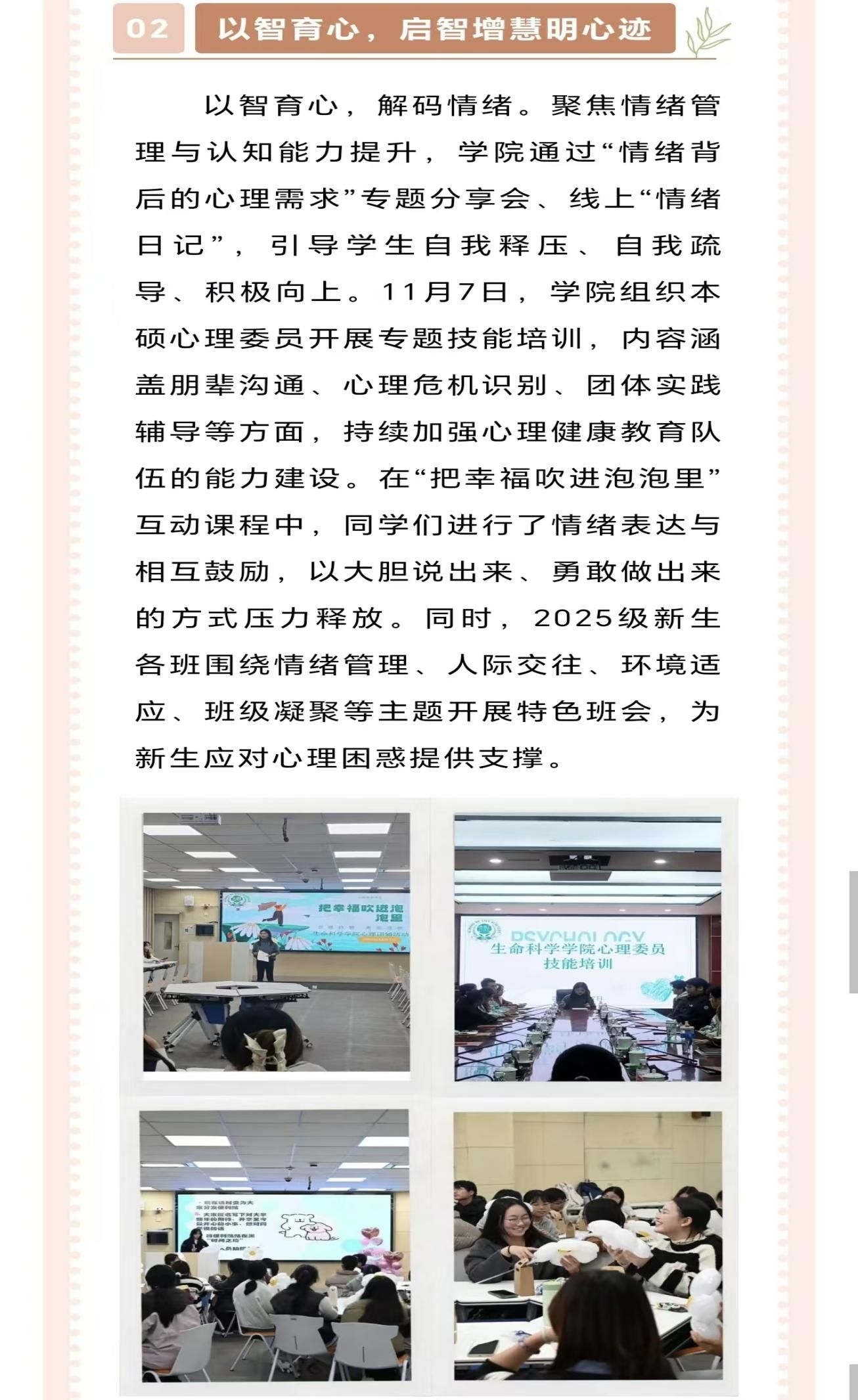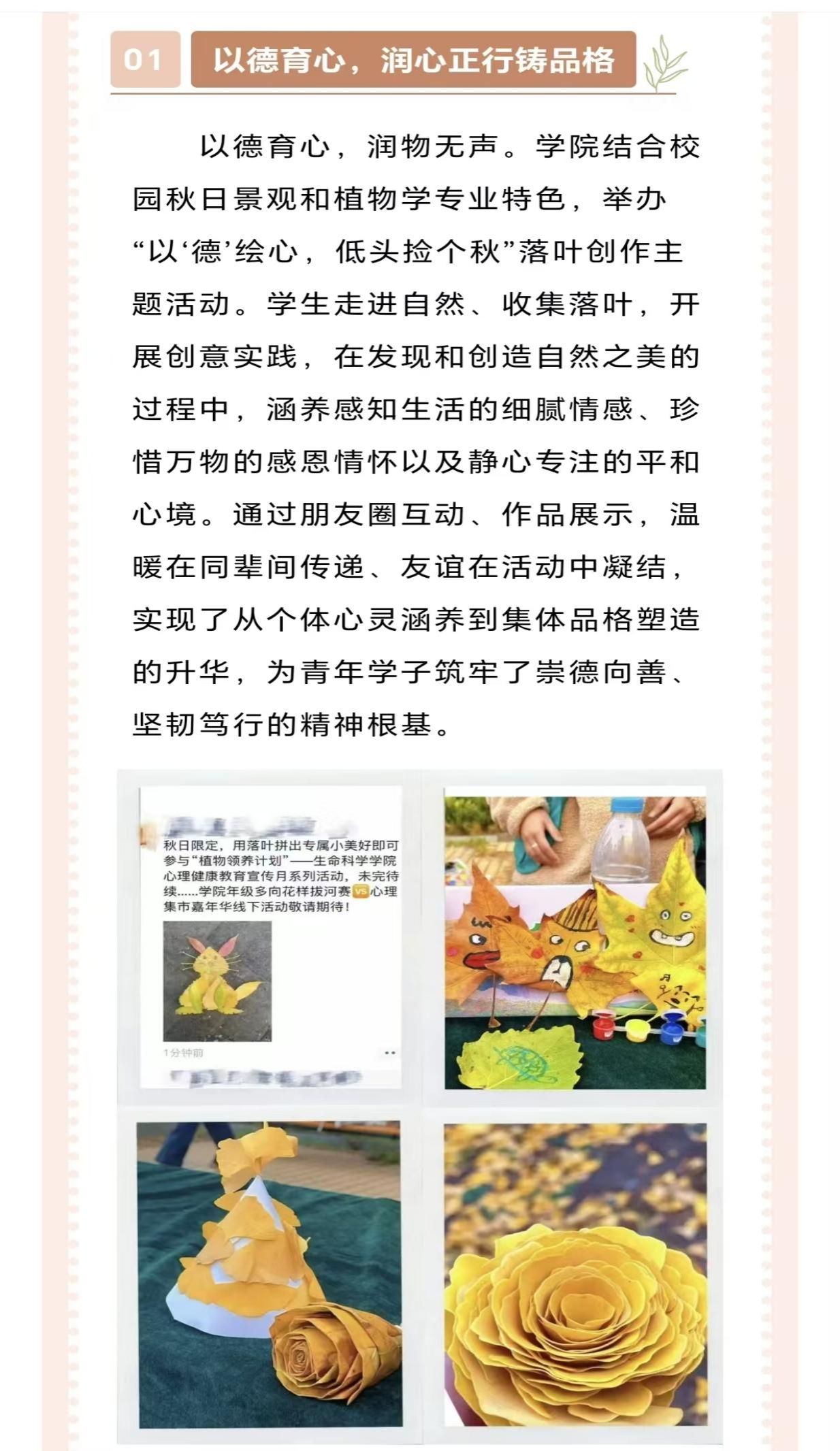 生命科学学院11月心理健康月紧扣“五育融心育”主线,将德育、智育、体育、美育、劳育分别打造成“可体验、可带走、可传播”的招牌活动——捡落叶、写情绪、四向拔河、治愈集市、全程摆摊,推动心理育人从讲座室走向操场、朋友圈与自然。