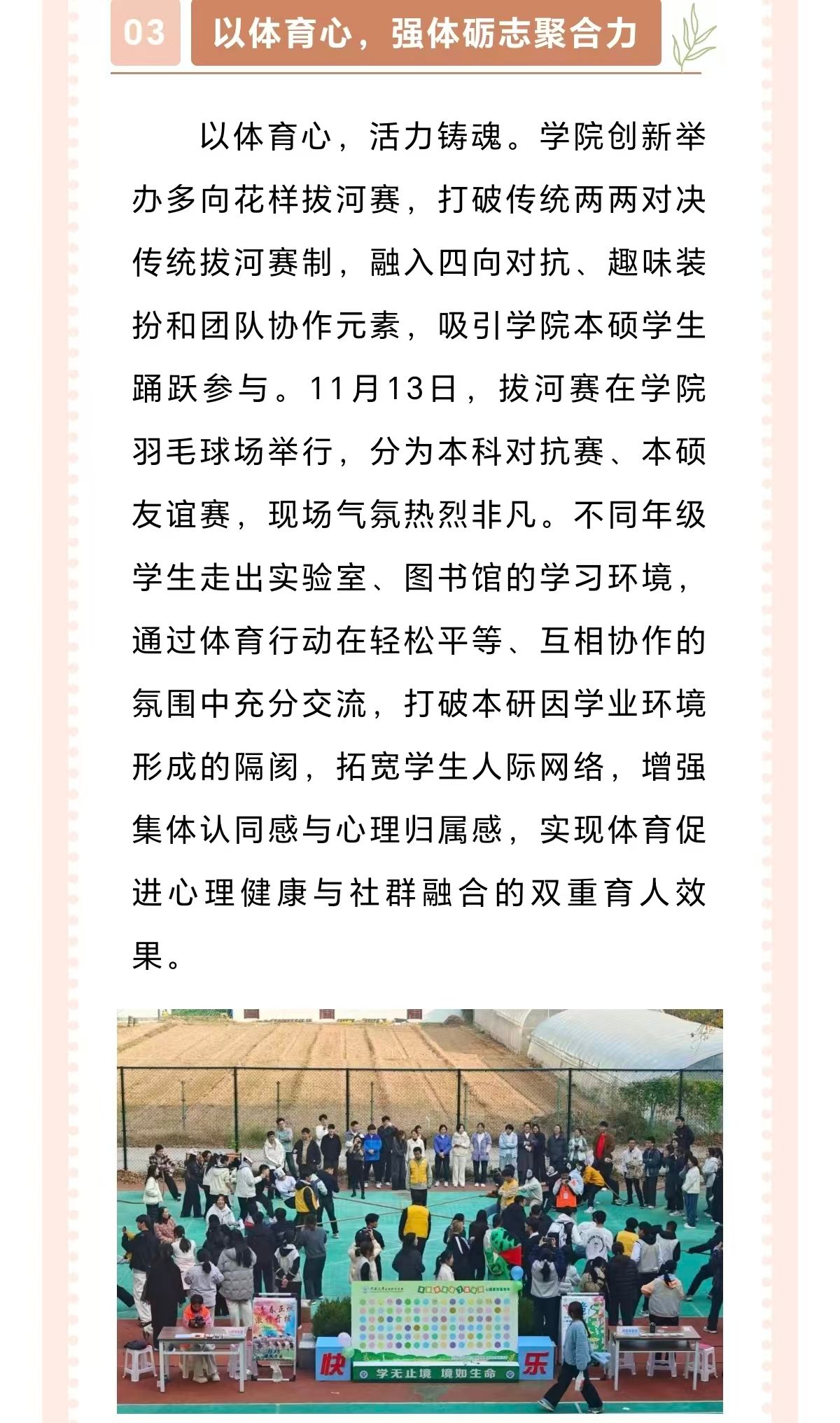 每一场活动都设置“情绪出口+人际破冰”双目标——落叶创作留下感恩,情绪日记说出压力,拔河赛打破本研隔阂,集市摊位互换温暖,劳动筹备共担责任——学生在“玩”里完成自我觉察,在“做”中实现同辈支持。