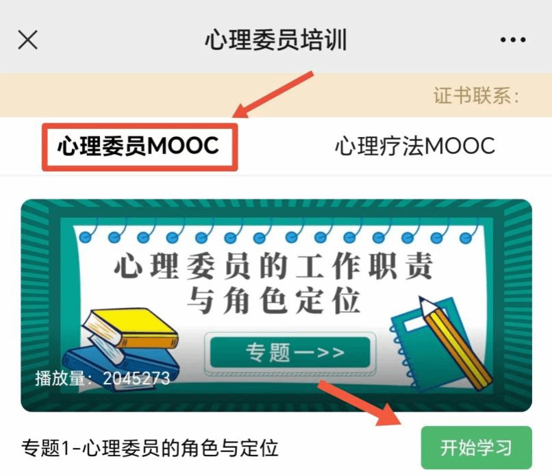 5.进入界面后选择“心理委员MOOC”,点击右下角“开始学习”。