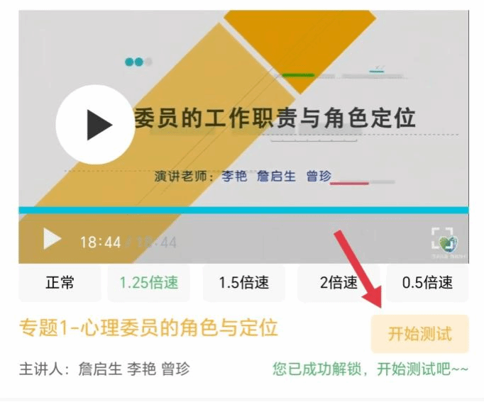 6.观看完视频后,点击“开始测试”,测试完后即进入下一专题学习。
