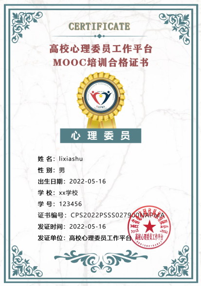 心理健康教育与咨询中心将根据各学院(部)上报的心理骨干培训名单统一付费(学生无需单独付费)。学习并通过测试的心理委员可以在平台直接获取“电子版”心理委员MOOC认证证书。