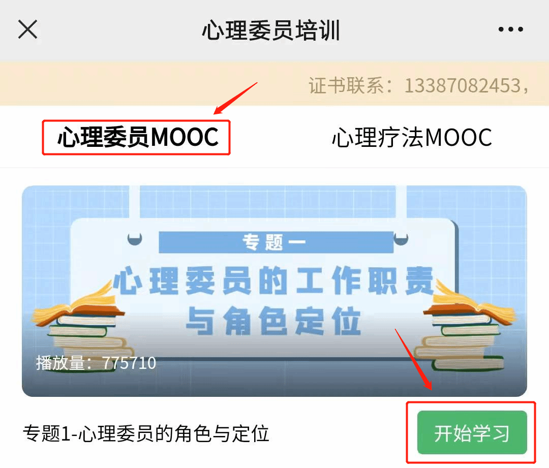 5.进入界面后选择“心理委员MOOC”,点击右下角“开始学习”。