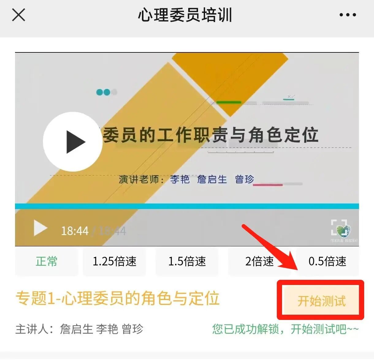 6. 观看完视频后,点击“开始测试”,测试完后即进入下一专题学习。